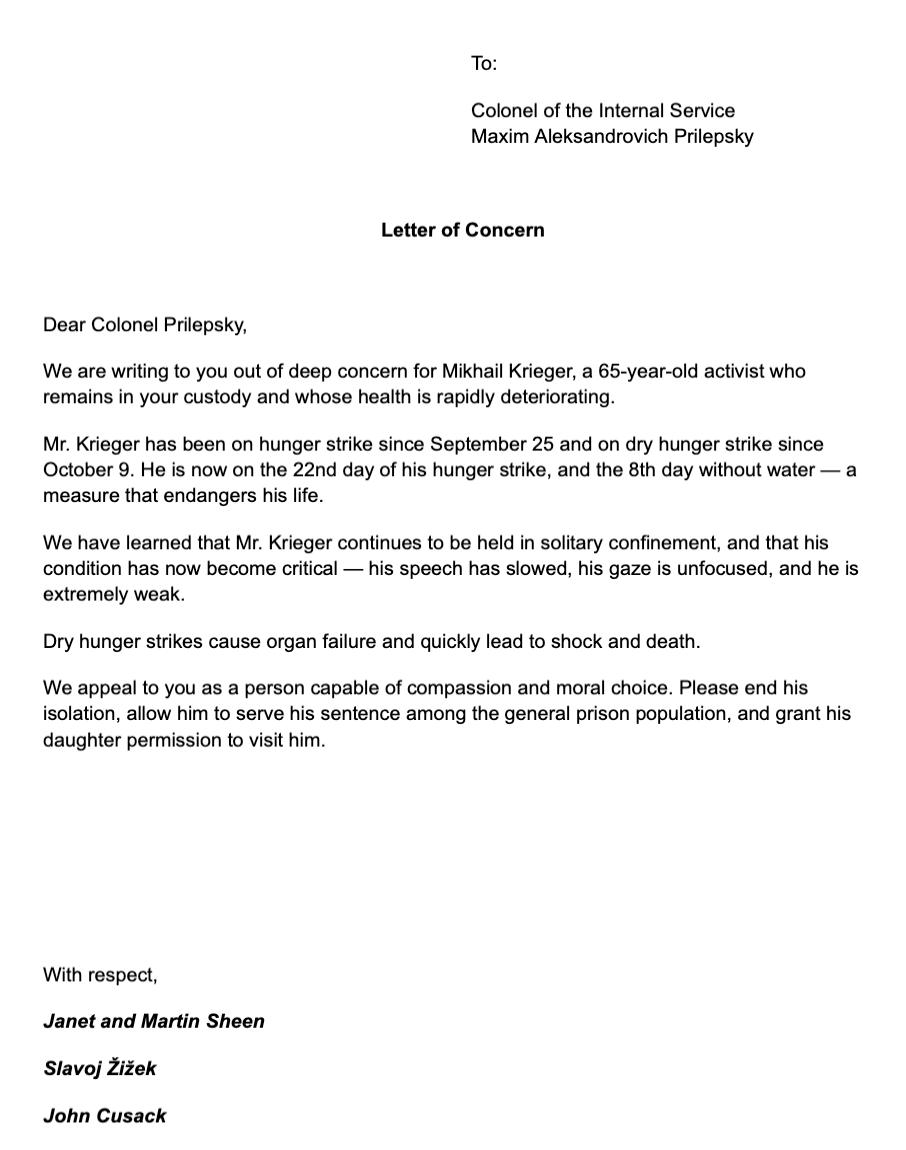 Супруги Шин, Кьюсак и Жижек напоминают, что Кригер держит голодовку с 25 сентября, а воду не пьет с 9 октября, напомнив начальнику колонии, что «сухая голодовка вызывает отказ органов и быстро приводит к шоку и смерти».