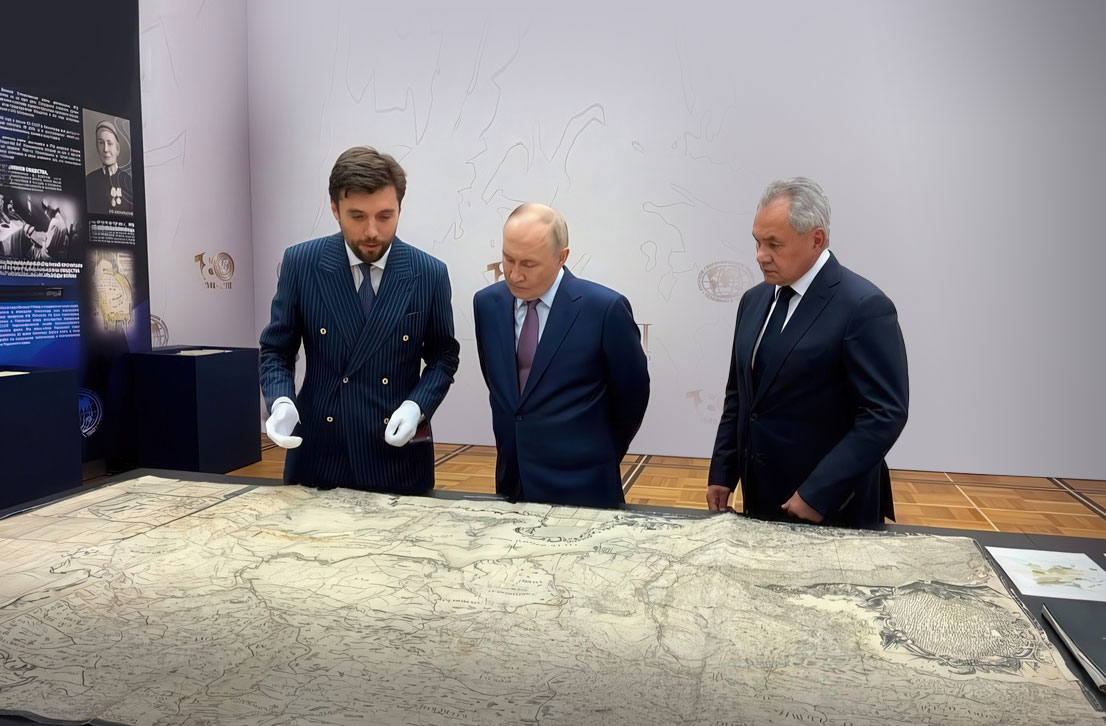 Владимир Путин и Сергей Шойгу во время посещения выставки проектов Русского географического общества изучают карты времен Российской империи, 23 октября 2025 года. Фото: RIA / Kremlin Pool
