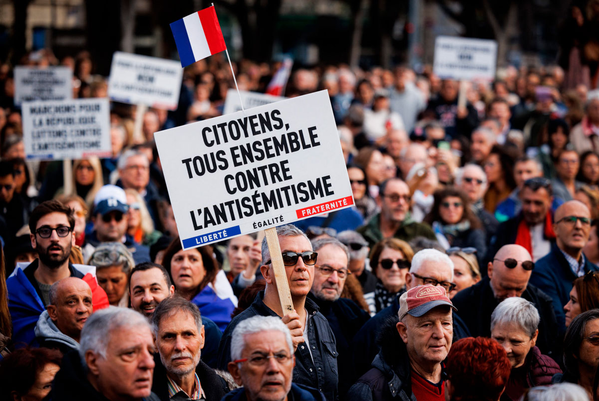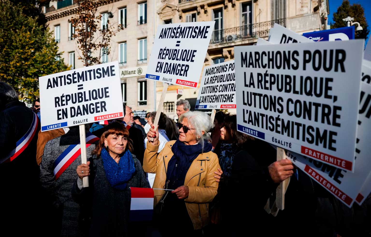 Протестующие держат плакаты с надписью «Антисемитизм = Республика в опасности» во время демонстрации против антисемитизма в Марселе, 12 ноября 2023 года. Фото: Клеман Махудо / AFP