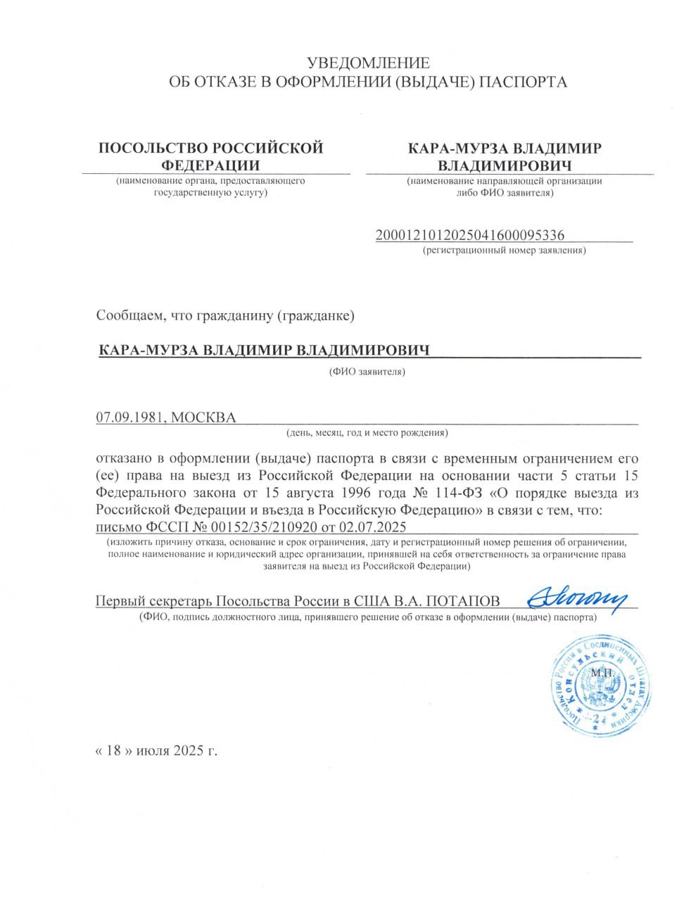 Владимир Кара‑Мурза рассказал в своем телеграм-канале, что российское посольство в США отказалось выдать ему загранпаспорт, сославшись на запрет на выезд из страны.