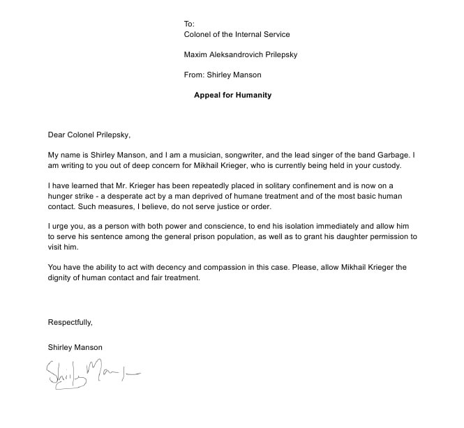“Krieger has been repeatedly placed in solitary confinement, and now he is on a hunger strike — a desperate step by a person deprived of basic human communication and humane treatment. Such measures, I am convinced, have nothing to do with either justice or order,” the singer's letter states.