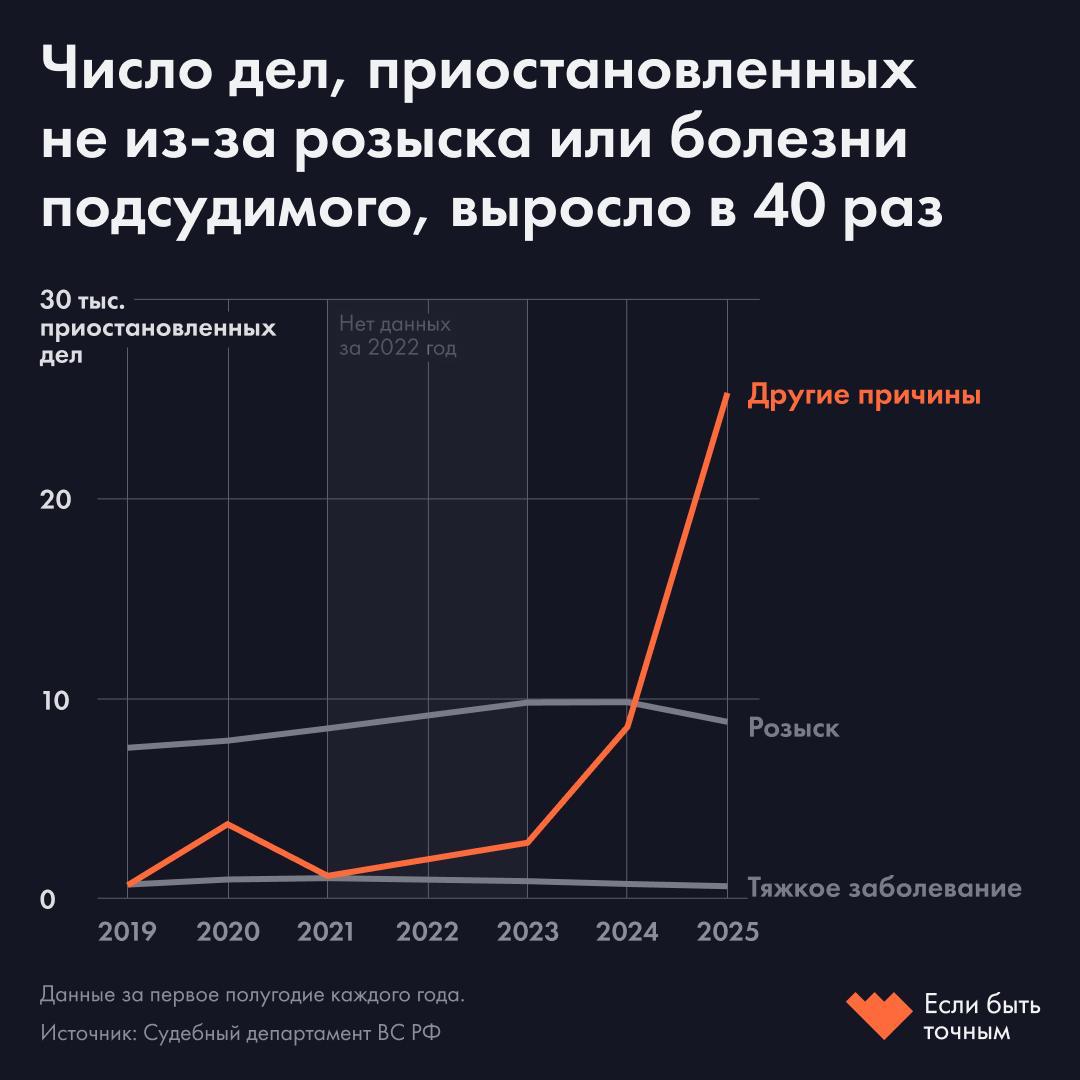 За первое полугодие 2025 года число уголовных дел, приостановленных не из-за розыска или болезни подсудимого, достигло 25,3 тысячи, обратил внимание на данные Судебного департамента Верховного суда дата-проект «Если быть точным». Для сравнения, в 2019-м на этом основании было приостановлено только 648 дел.