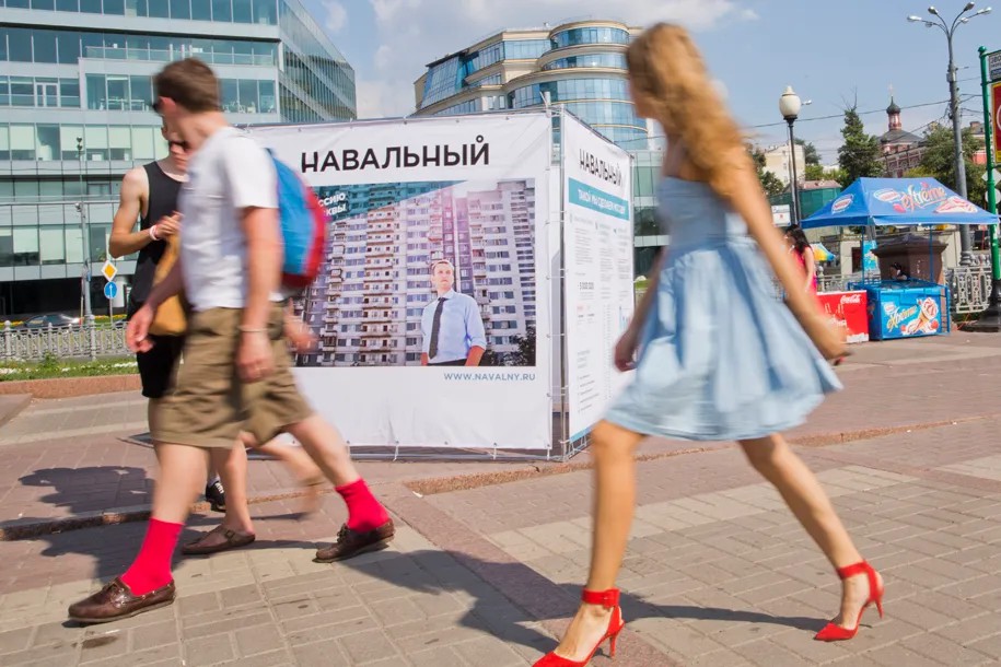 Пара стоит вдалеке от сцены, рядом с магазином «Женская одежда, дисконт». 21 августа — Алексей Навальный выступает в районе метро «Щелковская». Напротив сцены — ветхие многоэтажки, жители которых выходят послушать кандидата на балконы. Народа немного — человек 200. Пожилые люди устроились на стульчиках у самой сцены, остальные стоят, окружив Навального плотным кольцом. Два часа дня, жарко.