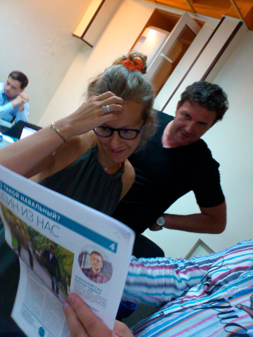 (Фото: Телеведущая Ксения Собчак и ее супруг актер Максим Виторган разглядывают экземпляр районной газеты). Районные газеты курирует Дмитрий Шоржин, улыбчивый парень 27 лет. Он работает в компании, которая занимается системной интеграцией и автоматизацией в гостиницах. Сейчас у него на работе мертвый сезон, поэтому он охотно берется за любую работу в штабе. «Сначала я занимался организацией мероприятий, а когда Навальный придумал районные газеты и Максим Кац написал в начале августа в твиттере, что для этого проекта нужны люди, решил взяться — мне всегда было интересно, как устроена печатная пресса».
